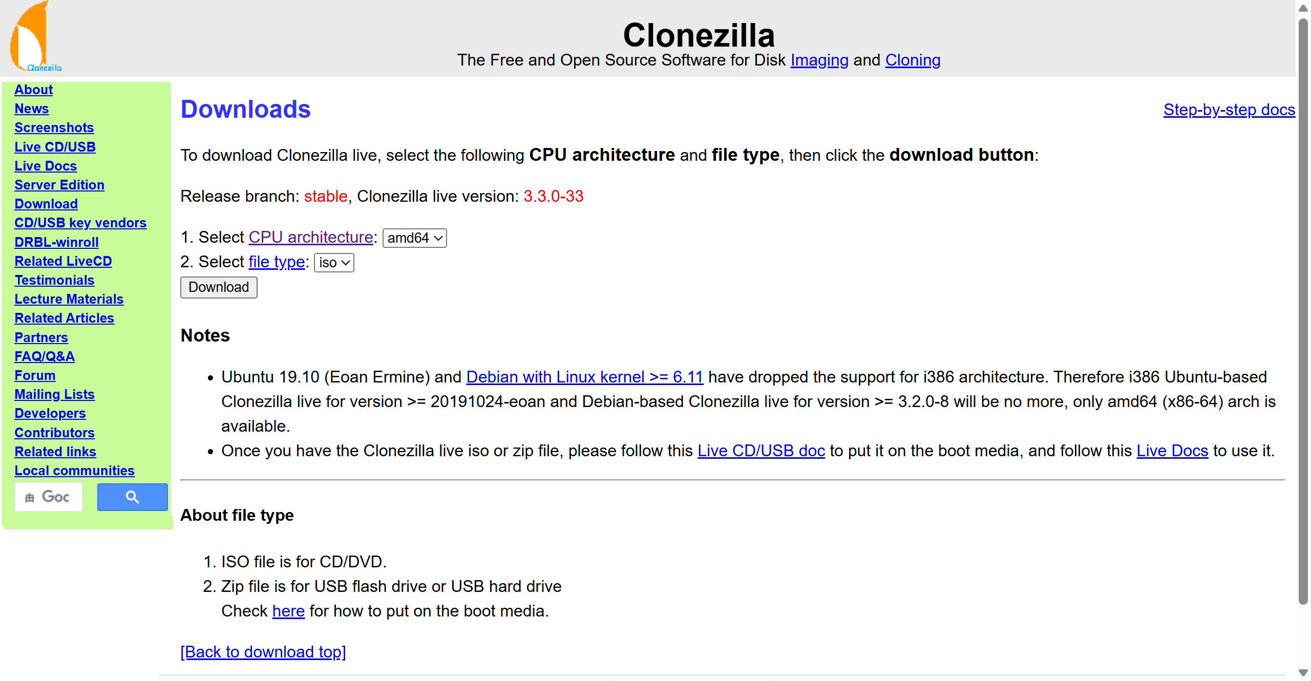 - 打开 CloneZilla 的官网:https://clonezilla.org/downloads/download.php?branch=stable,选择 ISO 下载 CloneZilla Live 镜像文件