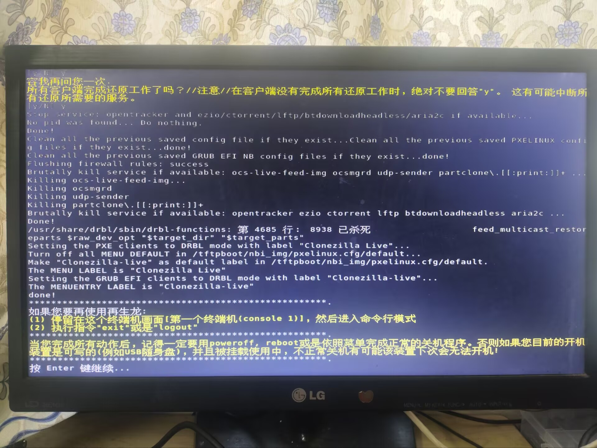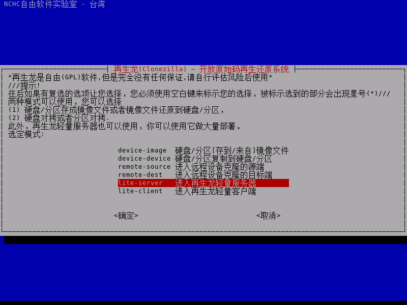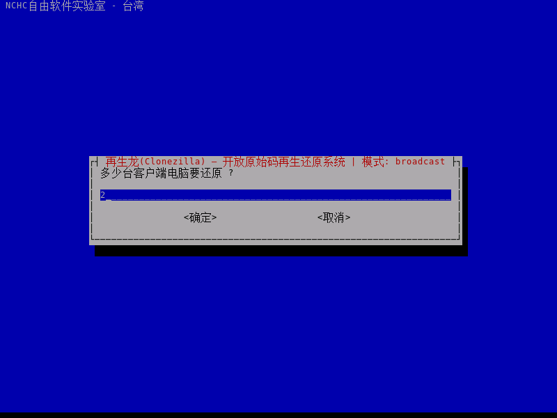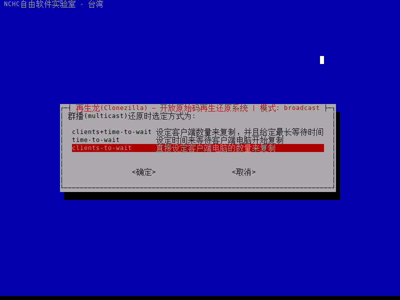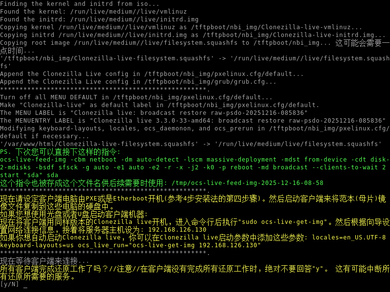 - 出现此提示后,表示同传任务已经准备就绪。此时可以开启客户端设备,通过网络启动进入 CloneZilla Live 系统