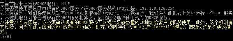 - 如果在局域网中检测到 DHCP 服务,则会显示相关信息,输入“Y”,然后回车